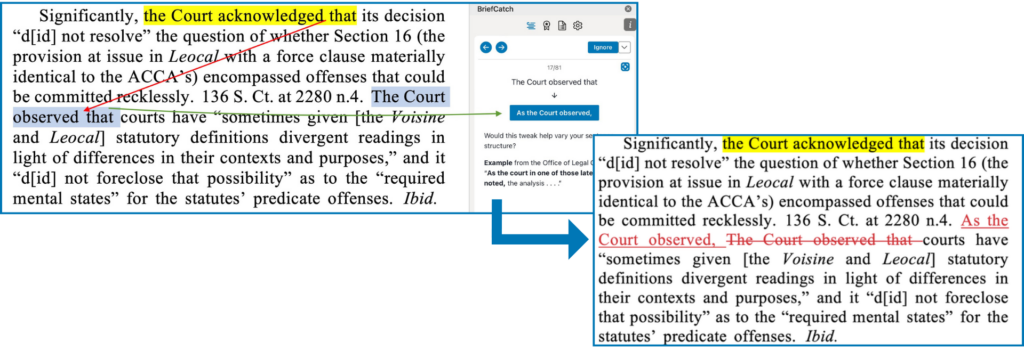 Another tip is to vary your sentence structure and shake loose from this pattern: “Someone noted/observed/stated that...” Here, BriefCatch could have helped even this rockstar brief in that regard.