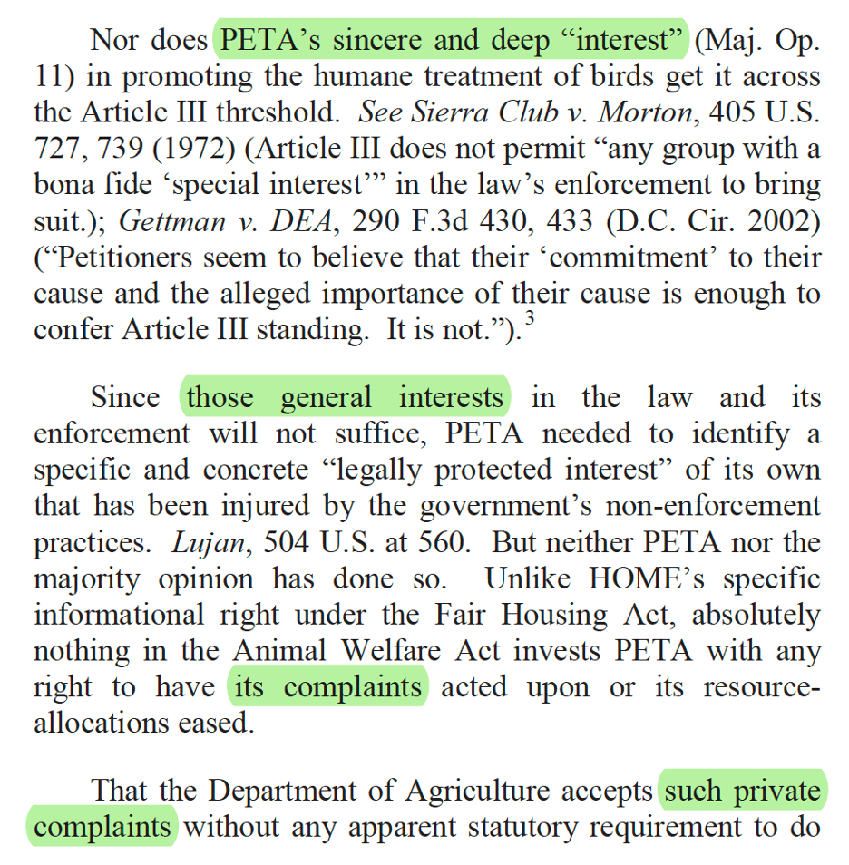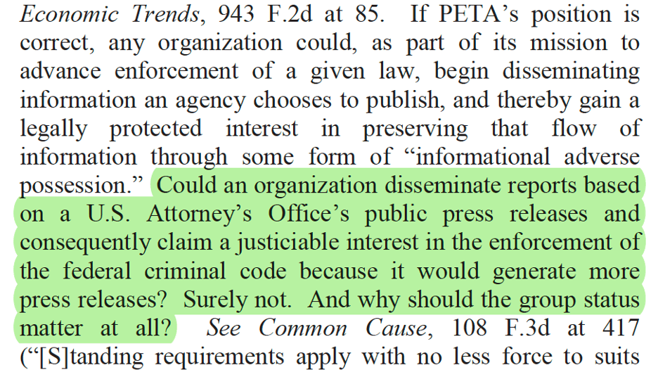 The dubitante (literally “doubting”) opinion, a delightful but seldom used species of concurrence, signals that the author has joined an opinion that she doesn’t really believe in, usually because of bad precedent. Judge Millett’s PETA opinion captures the spirit of the form perfectly: while showing proper respect for stare decisis (oops, there’s another one), she casts serious doubt on the doctrine of organizational standing—and she does so with impeccable style.