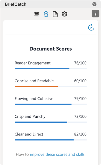 Click the Ribbon Award icon to generate scores for the document or selected portion. Each of the five measures combines global observations, such as variation in sentence length, with a sophisticated algorithm mining wording patterns in hundreds of categories. The scores include: